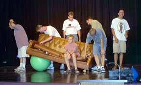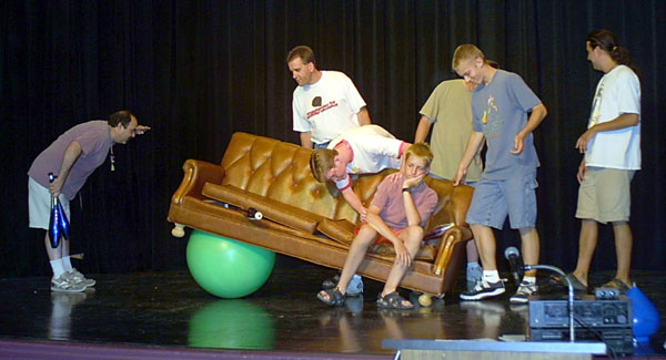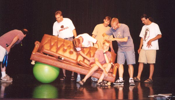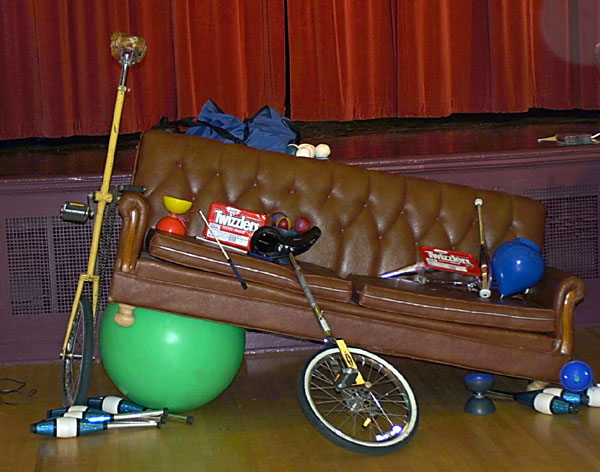 At 9 AM Saturday morning, we arrived at the UNL Nebraska Union to open up the room for the second day of the Flatland Juggling Festival. The festival was held at the Ballroom in the Union, it was a huge room graced by the long curtains of the Ballroom stage. After the doors were open some University of Nebraska Students looked in. They were all working at the Union today. One said that next week he was to be in a play where he was supposed to juggle, but he actually didn't know how and needed to learn. So, here I was on World Juggling Day appropriately teaching a new friend how to juggle. He learned quickly and commented on the banner that was hanging on one wall. It was the "I Think it Rolled Under the Couch" 'Couch Banner' (huge drawing of a couch). I tried to explain its meaning and went on to state our regrets that the one thing we hadn't acquired for the festival was a couch for the juggling space. Most Flatland Festivals have a couch sitting around somewhere. The Student's eye's lit up. He exclaimed that they were moving a couch around and couldn't find a place for it, so they had to put it out in a hallway, where it was still in the way. So together we went and retrieved the couch to its new Saturday home, the center of the Ballroom. The Student had to get back to work, we thanked each other several times, and then said good-bye. In mere minutes the couch was a permanent festival fixture, offering a leisure location for the occasional juggler, and secretively offering concealment for any escaping juggling prop.